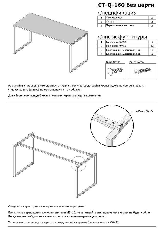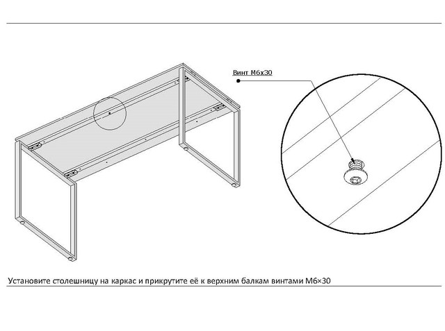 Конструкція стола проста в складанні: дві боковини з'єднані між собою двома балками, на які кладеться стільниця. Регульовані ніжки дадуть змогу виставити виріб на нерівній поверхні. На вибір покупця стіл може бути обладнаний отвором для комп'ютерних