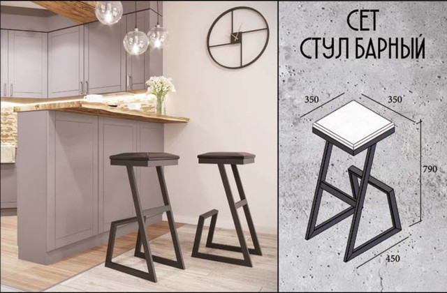 Стілець барний Сет - виготовлений за індивідуальним дизайном і являє собою суцільнозварну конструкцію. Дерев'яне сидіння має квадратну форму.
