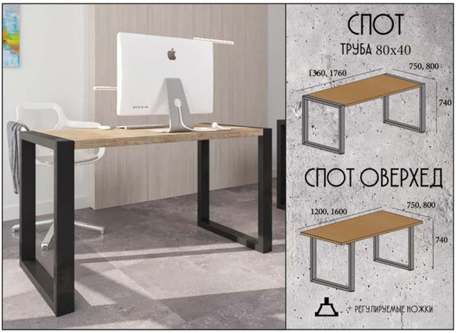 Стіл Спот виконується в різних колірних гамах, як наприклад металевий профіль може фарбуватися в 5 кольорів від виробника Метал-Дизайн Loft. Стіл виготовлений з металевого профілю, пофарбованого порошковою фарбою і ДСП різною колірною гамою під Ваш інтер'єр. Комплект столу складається з двох ідентичних опор. На ніжках столу встановлена пластикова фурнітура, для запобігання від пошкодження підлогового покриття.