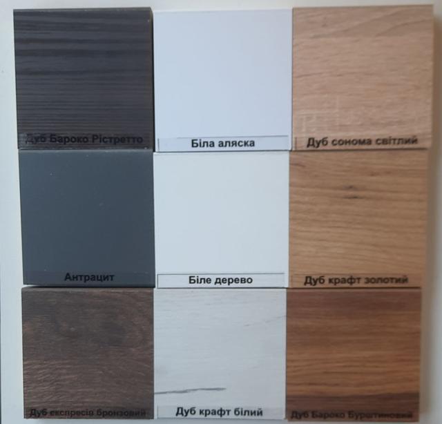 Вироби виготовляються з ДПС 16 мм, стандартні кольори ДСП: венге магія, дуб молочний, яблуня локарно, вільха темна, горіх лісове, біле дерево, дуб сонома світлий, дуб сонома трюфель, ваніль.*Виробник залишає за собою право без повідомлення споживача вносити зміни в конструкцію виробів для поліпшення їх технологічних і експлуатаційних параметрів. Різновид виробів може незначно відрізнятися від представлених на світлинах.