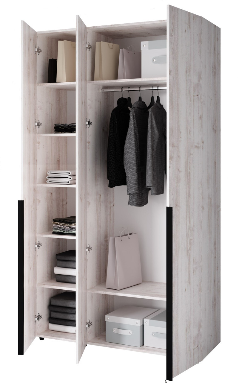 Представляємо вам тридверна відкривна шафа з полицями, шухлядами та штангою для одягу. Це універсальне рішення, яке ідеально підійде для будь-якої кімнати в будинку. Шафа має просторі відділення, де ви зможете зберігати як довгі речі на штанзі, так і складений одяг на полицях. Шафа виготовлена з високоякісних матеріалів (ЛДСП завтовшки 18 мм із крайкою ПВХ 0,5 мм), що гарантує його довговічність.
