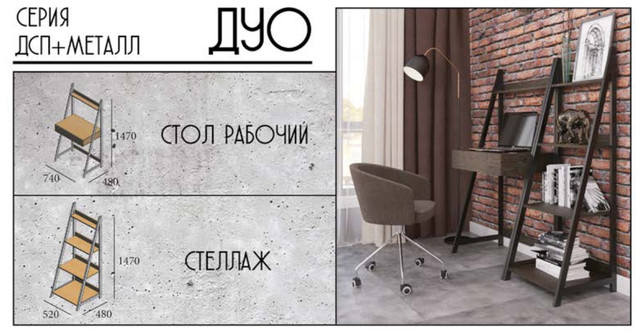 Стеллаж Дуо від українського виробника меблів Метал-Дизайн Loft, виготовлений у формі піраміди з прямокутними полицями, надаючи йому вишуканості й ексклюзивності, так само в цій серії є стіл робочий Дуо, який має гармонійний вигляд у комплекті. Серія Дуо чудово підходить для використання на балконі або лоджії з обмеженими квадратними метрами, завдяки своїм габаритам. Виготовлена з металевого профілю пофарбованої порошковою фарбою та ДСП різною колірною гамою під Ваш інтер'єр.